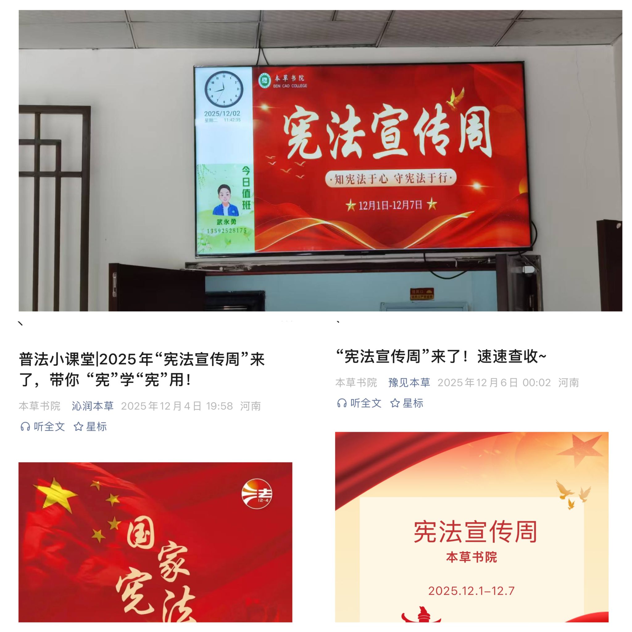 创新教育形式,以多维度举措实现宪法宣传线上线下全覆盖。以班会形式为基础阵地,育人导师深入班级,结合中医药专业特色,解读宪法文化传承、公民健康权益等相关内容,让抽象法律条文与专业学习紧密结合。线上依托融媒体矩阵,持续发布宪法解读推文及普法短视频;线下通过社区宣传栏、智慧大屏展示宪法知识海报,营造沉浸式学习氛围,确保宣传广覆盖,有成效。
