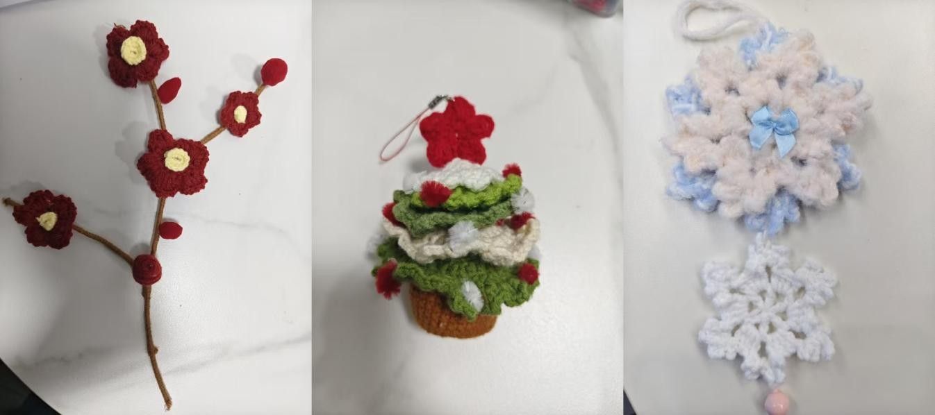 本次活动同学们积极响应,踊跃报名参与,展现出极高的热情。活动现场为参与者精心准备了包括钩针、各色毛线在内的全套手工材料,大家围绕雪花、暖冬生灵等富有大雪节气特色的主题展开创作,通过一针一线的细致手工,体验慢节奏带来的宁静与专注。同学们沉浸于手工的乐趣中,无序的毛线逐渐被钩织成雪花、小树、花环等,大家暂时放下日常学习的压力,放松心情,专注当下,享受片刻的宁静与自我沉淀。活动最后,同学们手持着亲手完成的钩织作品作品相互展示,每件作品都是参与者内心的映射,活动现场气氛愈发热烈。同学们纷纷表示,这次活动不仅为他们搭建了展示自我的艺术平台,更让他们在创作中收获了专属作品,为平淡生活增添了一分诗意与浪漫。